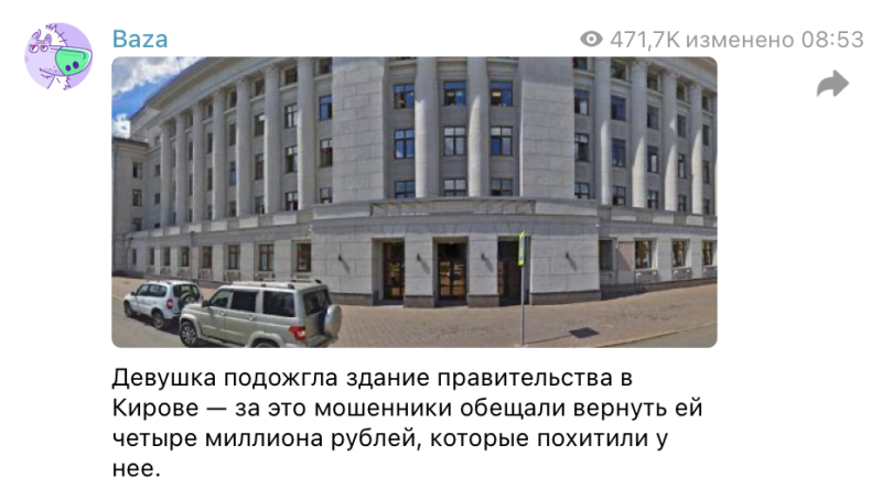 В последнее время случаи выполнения указаний мошенников участились. В Кирове аферисты украли со счёта 23-летней девушки 4 млн рублей и убедили поджечь здание правительства, чтобы их вернуть. Ночью она разбила стекло в здании и бросила туда взрывчатку, сделанную из подручных средств. Возгорание на площади в полметра потушили быстро, и никто не пострадал. А вот девушку может ждать уголовное дело, сообщает "Газета.ру".
