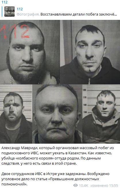 Ранее сообщалось, что пятеро заключённых, включая Александра Мавриди, сбежали из ИВС в Истре. Мавриди подозревается в убийстве главы "Мясной империи" Владимира Маругова, остальные участники побега - в краже.