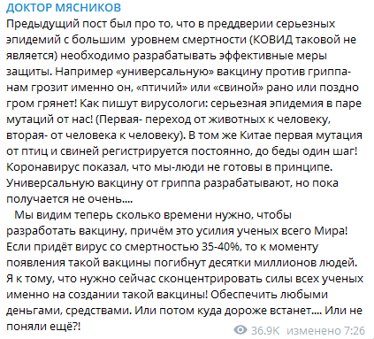 Мы видим теперь, сколько времени нужно, чтобы разработать вакцину, причём это усилия учёных всего мира! Если придёт вирус со смертностью 35-40%, то к моменту появления такой вакцины погибнут десятки миллионов людей, - пишет Мясников в Telegram.