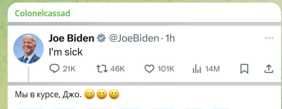 Байден заявил о ковиде. Верится мало. Во что верится - в притворный диагноз после получения Агентством национальной безопасности (АНБ) улик о причастности окружения Байдена к покушению на Трампа. Для упёртого Байдена это единственный фактор, который может убедить его выйти из избирательной кампании. Но это и крах всей Демпартии,