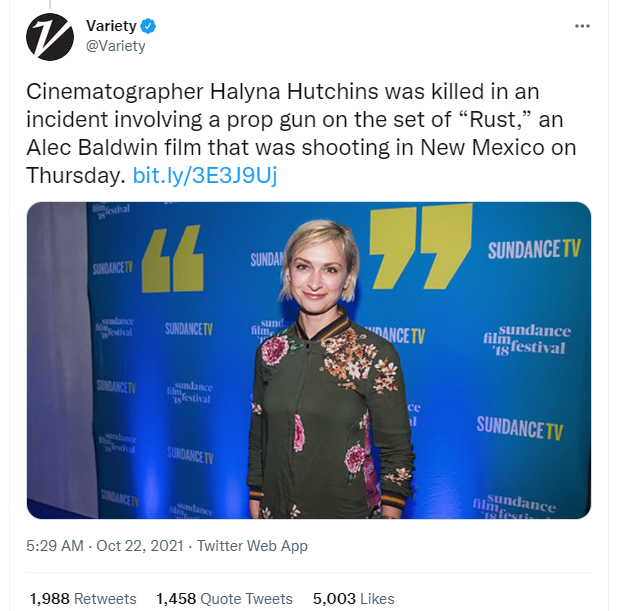 Стало известно, что оператор Халина Хатчинс, которую по трагической случайности застрелил на съёмках голливудский актёр Алек Болдуин, была родом из СССР. Она выросла "на советской военной базе, окружённая оленями и атомными подводными лодками".