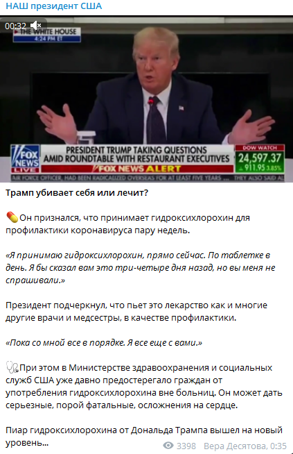 Трамп убивает себя или лечит? Пиар гидроксихлорохина от Дональда Трампа вышел на новый уровень, - пишет Telegram-канал "Наш президент США".