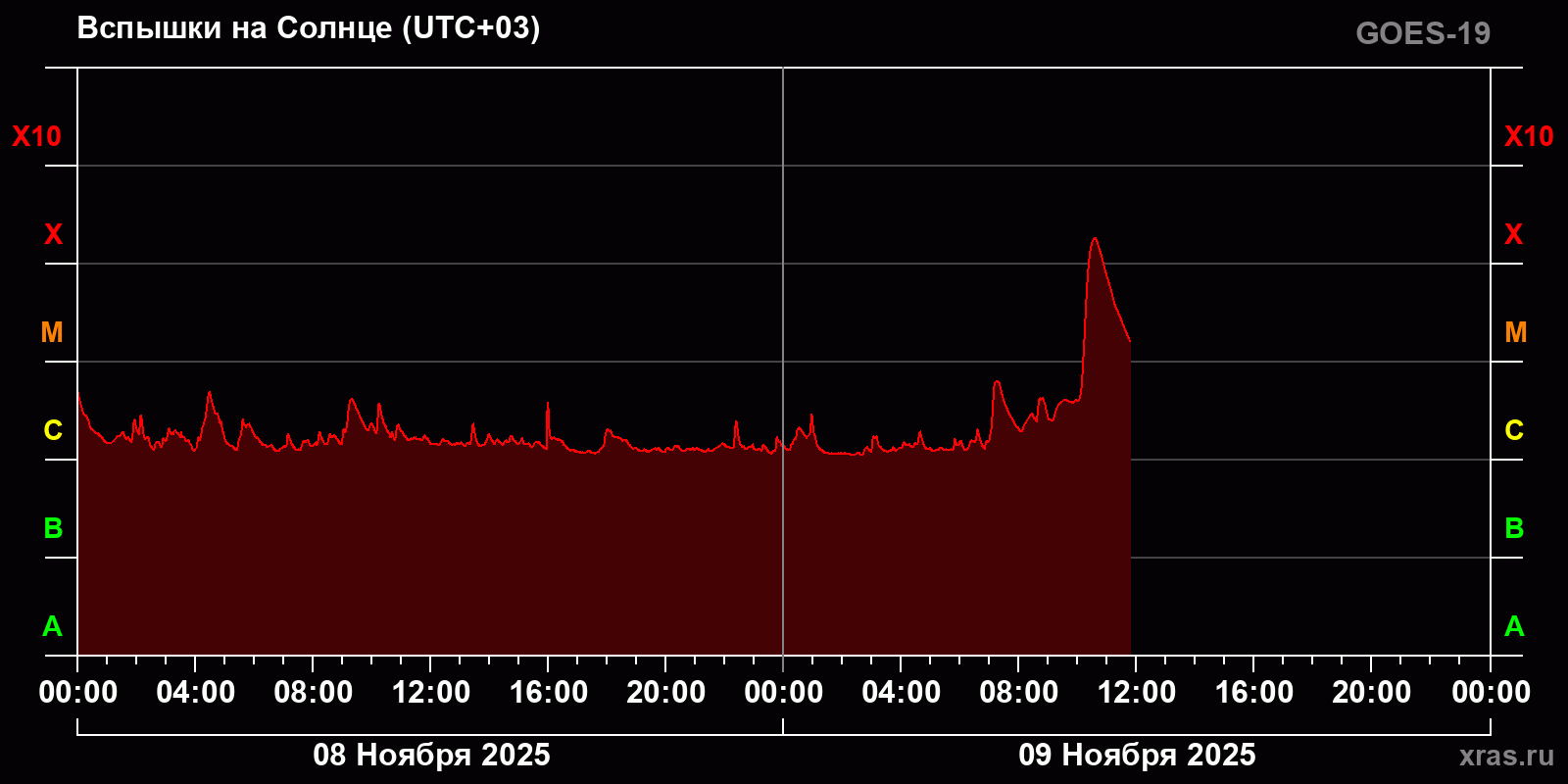 Утром 9 ноября ученые зафиксировали на Солнце одну из самых сильных вспышек за последнее время. Мощность этого взрыва была настолько велика, что его отнесли к высшему классу – X. Ему присвоили точный балл X1.79. Об этом сообщили в Институте космических исследований (ИКИ) РАН.