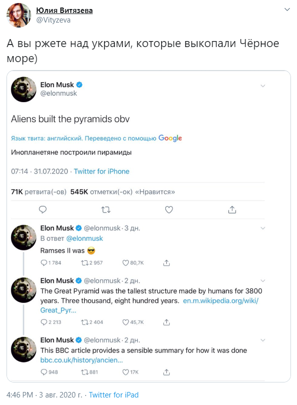 Инопланетяне построили пирамиды, это очевидно. Великая пирамида была самым высоким сооружением, созданным людьми за 3800 лет. Эта статья "Би-би-си" даёт разумное объяснение, как это было сделано, - пишет он в Twitter.
