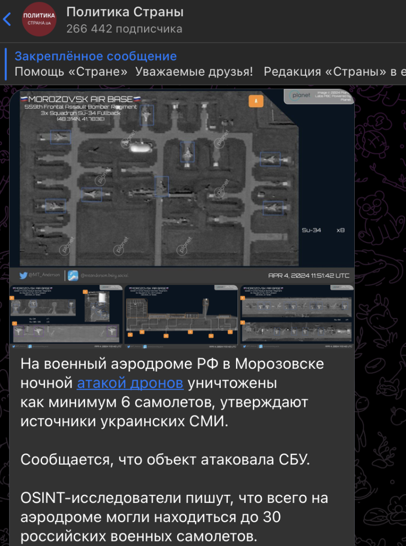 В Морозовске базируется аэродром, откуда взлетают тактические бомбардировщики типа Су-24 и Су-24М, несущие авиабомбы. Вскоре источники авторитетного издания Reuters стали сообщать, что на русской авиабазе были уничтожены шесть военных самолётов, а ещё восемь повреждены.