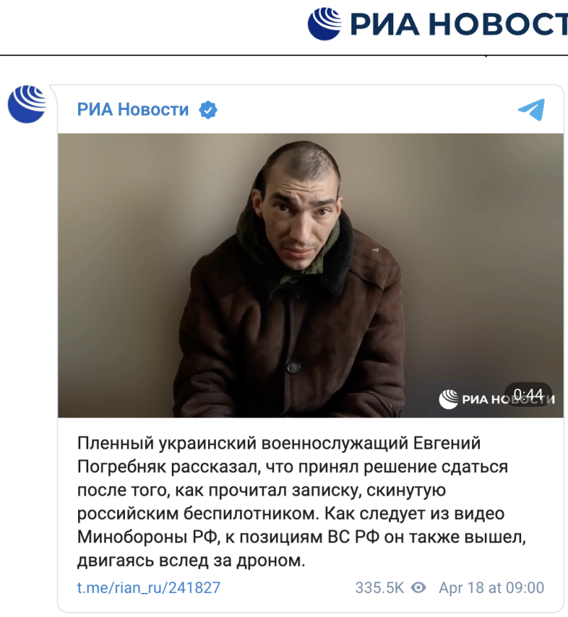 Ранее Царьград писал о том, что пленный украинец заявил, что командиры взвода заставляли его и товарищей выполнять задания на грани жизни и смерти. Боевые задачи они выполняли в лесополосе Урожайного в ДНР, где постоянно происходят обстрелы. Евгений Погребняк, будучи на боевой позиции, прочёл сброшенную с дрона записку и добровольно сдался русским.