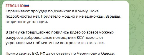 Больше подробностей появилось в околовоенных телеграм-каналах. Один из авторов "Типичного Джанкоя" написал: "По Джанкою, предварительно, первая волна баллистика, возможно, ATACMS, вторая волна аналог "Шторм", но звук пролёта иной".