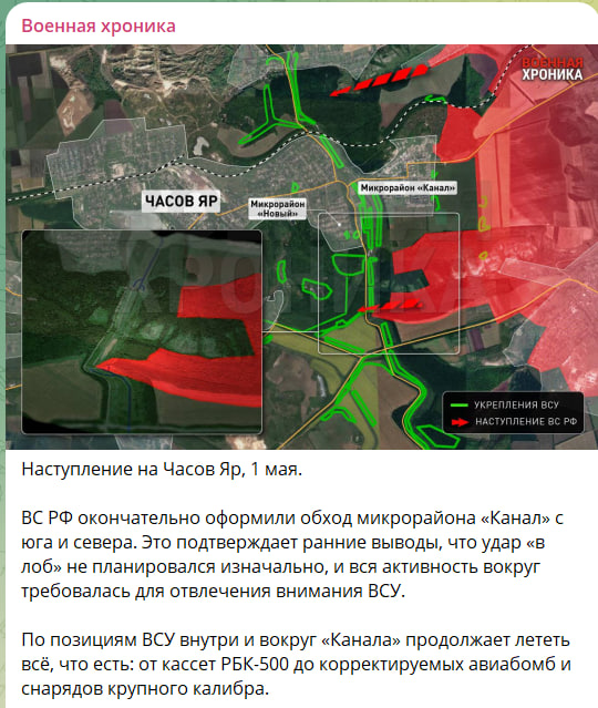 ВС РФ напрямую атакуют микрорайон "Канал" на востоке города, а также обходят его с севера и с юга через сёла Богдановка и Ивановское (Красное). В центре и на севере ВСУ держат оборону. Теперь же на южном фланге ВС РФ удалось перейти канал Северский Донец — Донбасс и продвинуться в направлении города. <…> Российские силы форсировали канал в Часове Яре в 1 км юго-восточнее города. Теперь это лишь вопрос времени, когда они войдут в город с востока или с юга,