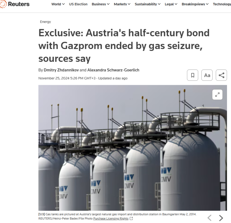 13 ноября австрийская газовая компания OMV (31,5% её акций принадлежит правительству страны) объявила о завершении рассмотрения своего иска, поданного в германский арбитраж против "Газпрома". Австрийцы желали взыскать у русской компании 230 млн евро (239 долларов США), ссылаясь на то, что поставки русского газа в Германию (там действует "дочка" OMV) были нерегулярными.