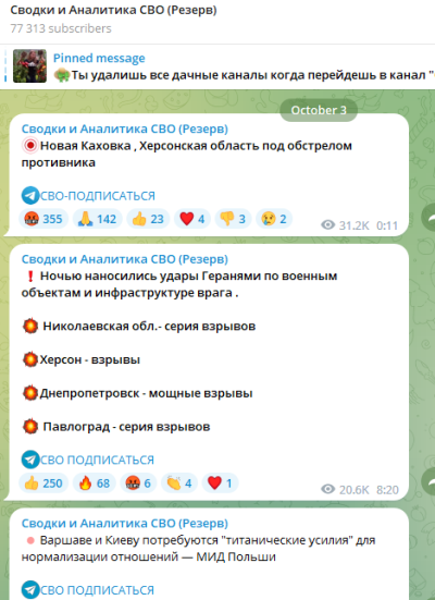 В ночь на 3 октября Вооружённые силы России нанесли серию ударов по территории Украины. ТГ-каналы пишут, что удар наносился “Геранями”. Целью русских стали военные объекты в Николаевской области, в Херсоне, Днепропетровске. Рассказываем всё, что известно на этот час о ситуации на Украине.