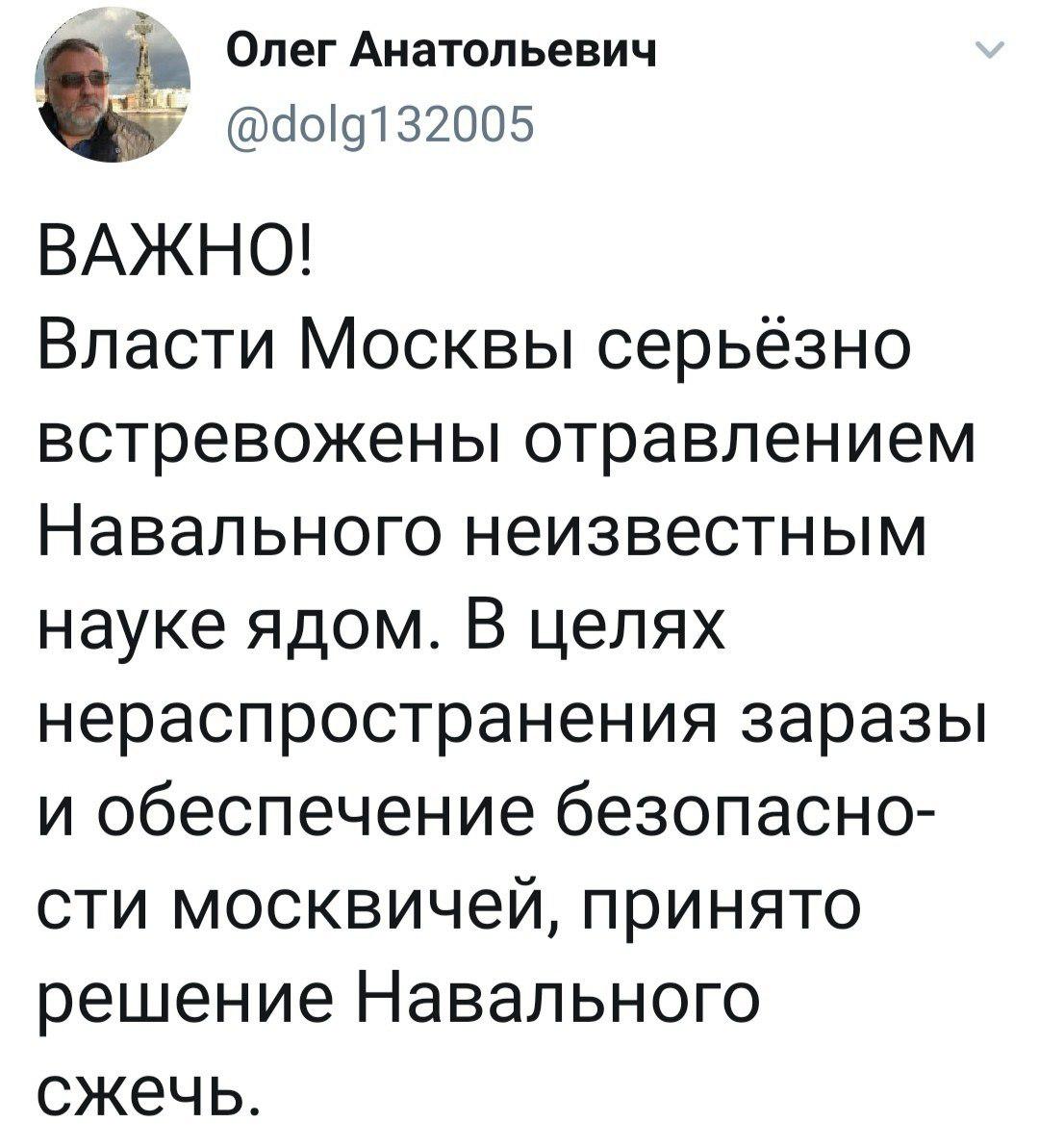 "Власти Москвы серьёзно встревожены отравлением Навального неизвестным науке ядом, - зло иронизирует полковник запаса Олег Анатольевич. - В целях нераспространения заразы и обеспечение безопасности москвичей принято решение Навального сжечь".