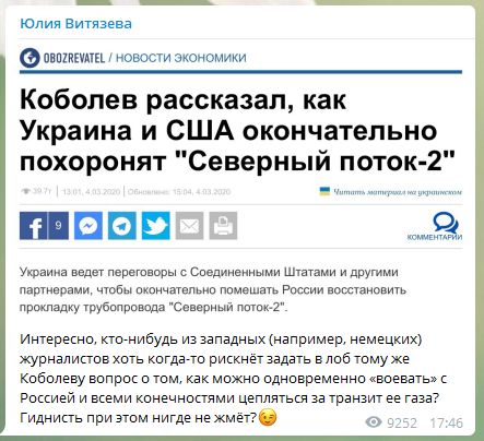 Журналист Юлия Витязева прокомментировала статью о том, что Украина и США окончательно похоронят "Северный поток - 2". В ней председатель правления "Нафтогаза Украины" Андрей Коболев высказывает свою точку зрения.