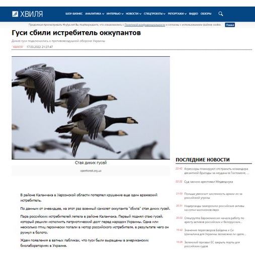 Разумеется, эти цифры не имеют ничего общего с реальностью. Но Киев не останавливается. Издание "Хвиля" опубликовало новость с заголовком "Гуси сбили истребитель оккупантов". Материалы аналогичного содержания тут же выпустили и другие СМИ.