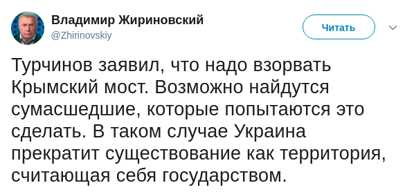 Лидер партии ЛДПР Владимир Жириновский не сдержался и жестко осадил у себя в Twitter размечтавшегося взорвать Крымский мост с помощью украинских крылатых ракет Александра Турчинова. "В таком случае Украина прекратит существование", - вразумил оппонента депутат.