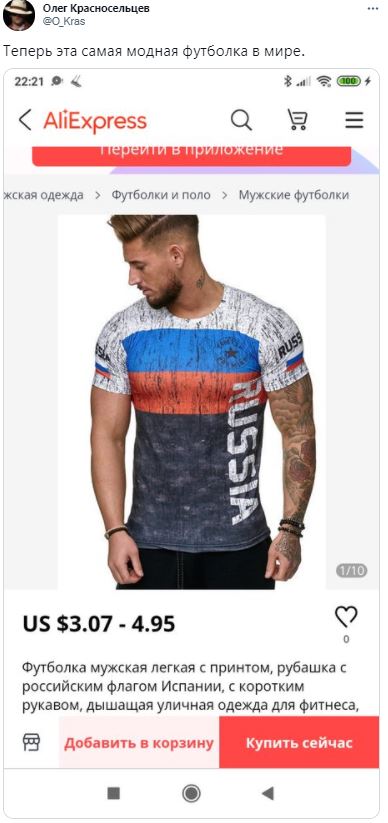 В Сети начинает набирать обороты мода на футболки с цветами русского флага и надписью "Russia". На это обратил внимание пользователь Twitter Олег Красносельцев, который выложил скриншот объявления китайского интернет-магазина AliExpress.