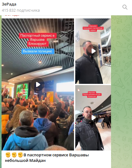 И после этого в Варшаве начались первые массовые протесты украинцев против Зеленского. 300 мужчин заблокировали паспортный сервис ГП "Документ" в Варшаве, требуя выдать им паспорта. Местные жители просят приносить протестующим еду и воду.