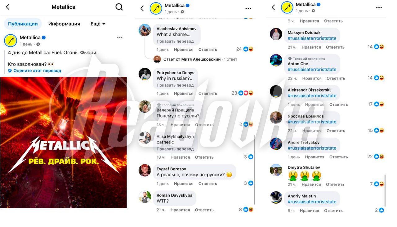 Американская рок-группа Metallica анонсировала свой новый концерт Fuel. Fire. Fury, представив обложку на русском языке с надписью "Рёв. Драйв. Рок". Этот ход вызвал неожиданный шквал негодования среди украинцев, которые, как оказалось, надеялись на анонс концерта на мове.
