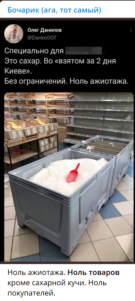 "Это сахар. Во "взятом за два дня Киеве". Без ограничений. Ноль ажиотажа", - с издёвкой написал в Telegram украинец Олег Данилов. И выложил фото из киевского супермаркета.
