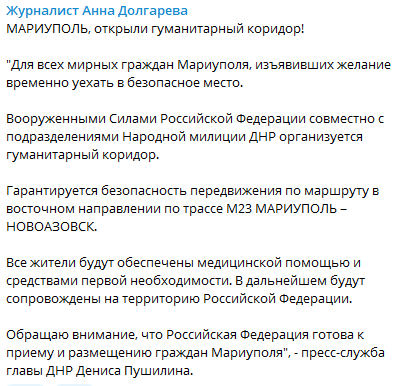 Как сообщает журналистка Анна Долгарева, только что армия России открыла гуманитарный коридор в Мариуполе. Мирные жители при желании могут безопасно покинуть город.