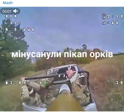 В украинском сегменте Telegram широко разошлось видео, которое предоставил оператор украинского дрона. На кадрах видно, как беспилотник стремительно летит к пикапу русских военных и уже в самом авто запись прерывается, что означает взрыв.