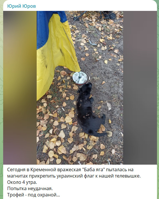 Сегодня в Кременной вражеская "Баба-яга" пыталась на магнитах прикрепить украинский флаг к нашей телевышке. Около 4 утра. Попытка неудачная,