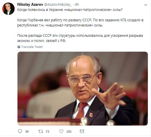 Бывший премьер-министр Украины Николай Азаров заявил в своем Twitter, что украинские "национал-патриотические" силы были созданы КГБ по прямому указанию тогдашнего генсека КПСС Михаила Горбачева. По его словам, именно Горбачев начал работу по развалу СССР.