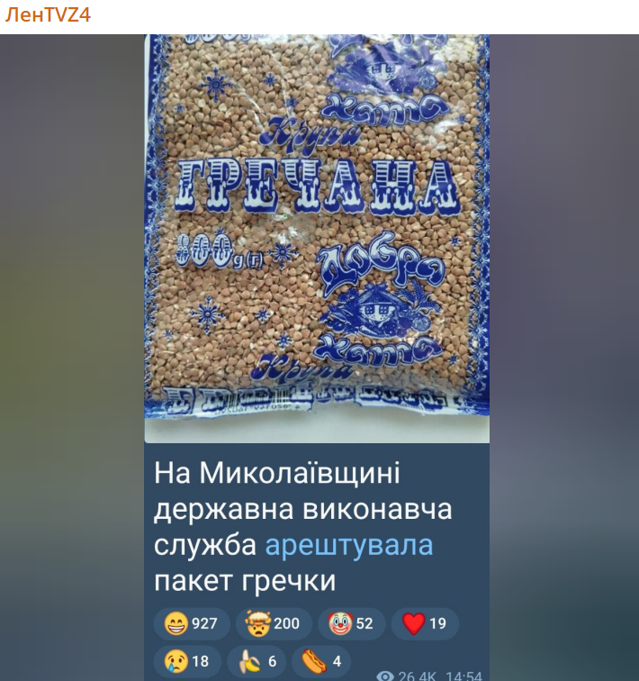 В конце августа в Николаевской области Государственная исполнительная служба Украины арестовала 800-граммовый пакет гречки.