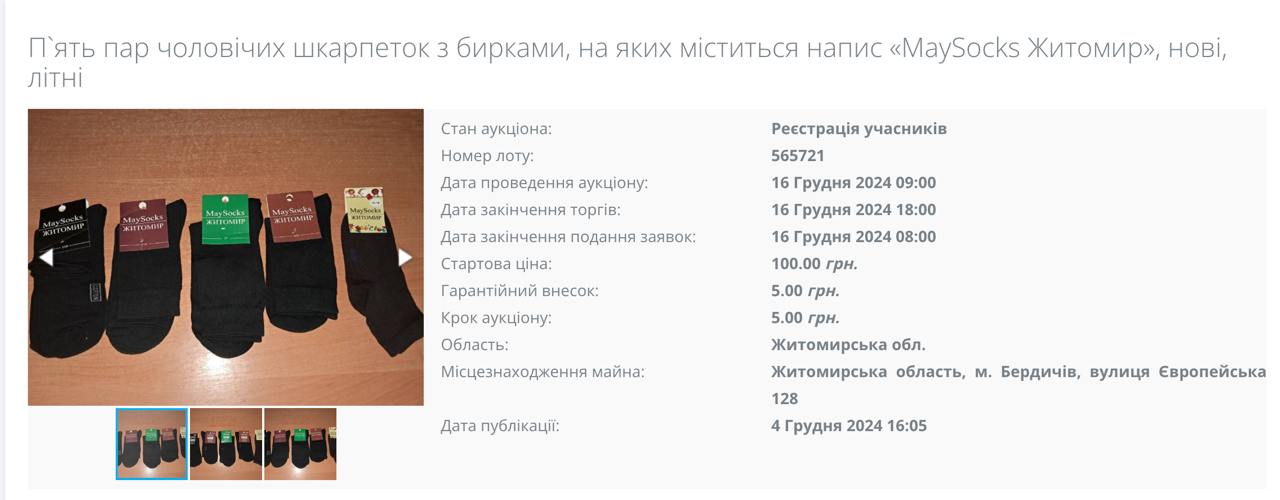 Необычный лот появился на Украине. Государственная исполнительная служба, которая занимается взысканием долгов по решению суда и органов исполнительной власти, арестовала и выставила на торги пять пар новых носков, арестованных украинскими приставами в счёт погашения долга в городе Бердичеве (Житомирская область).