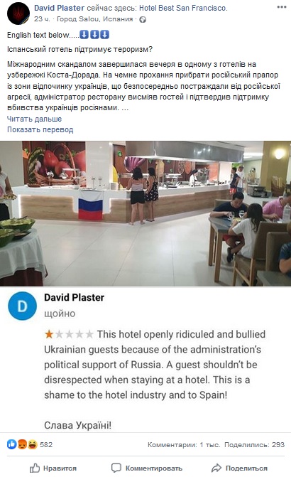 По его словам, инцидент произошёл в испанском отеле города Салоу. Нескольким украинским семьям не понравился флаг России, вывешенный в ресторане гостиницы. Они потребовали убрать триколор, чтобы "не чувствовать себя ужасно во время ужина". Однако администратор отеля не только отказался это сделать, но ещё и добавил, что этот флаг выражает его позицию и позицию всей Испании. Свидомые украинцы, по словам пользователя, были "шокированы" подобным поворотом событий.