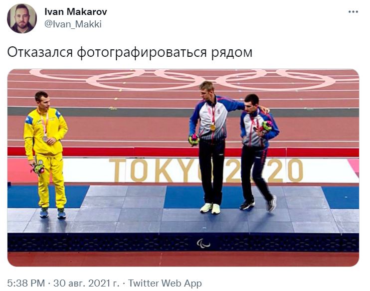 На снимке, который был опубликован в соцсетях, виден русский спортсмен Дмитрий Сафронов, завоевавший золото на забеге на 100 метров среди атлетов с церебральным параличом или другими нарушениями координации. Рядом с ним стоит ещё один представитель России - обладатель бронзовой медали Артём Калашян. И примерно в четырёх метрах от них встал легко узнаваемый по ярко-жёлтой олимпийке с синими вставками украинец, который завоевал серебро.