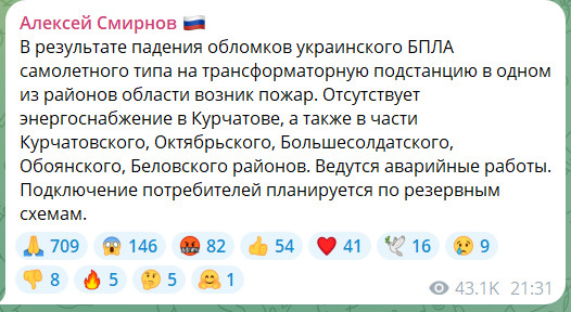 Украинский БПЛА упал на подстанцию, Курчатов и ещё 5 районов частично остались без света, сообщил врио губернатора.