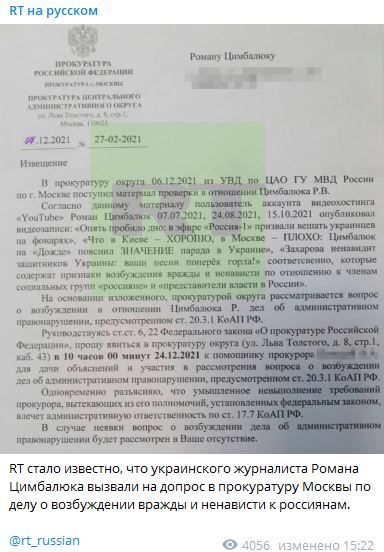 Ранее сообщалось, что Цимбалюка могут привлечь за экстремизм. Провокационные высказывания скандального корреспондента в ноябре уже привлекали к себе внимание прокуратуры.