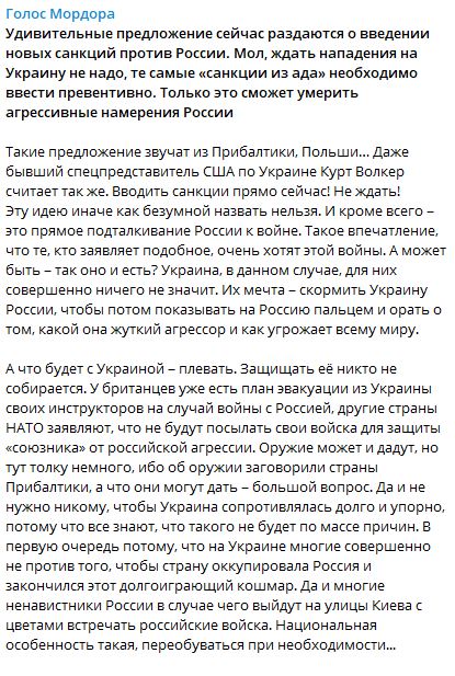 К такому выводу пришёл автор Telegram-канала "Голос Мордора". Он обратил внимание на призывы некоторых политиков в Прибалтике, США и Польше ввести против России "санкции из ада", не дожидаясь её "вторжения" на Украину. Превентивно.
