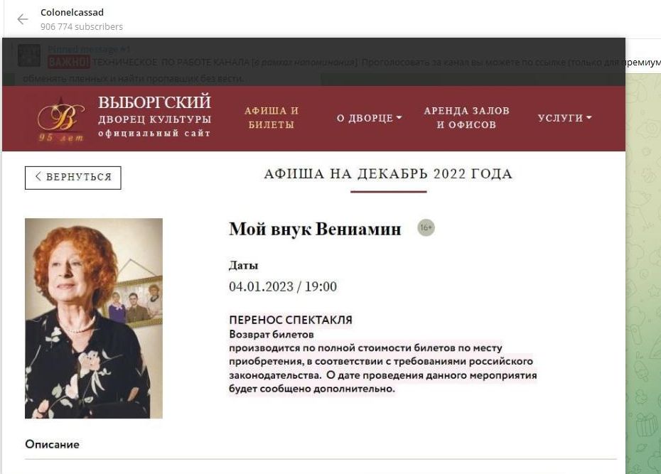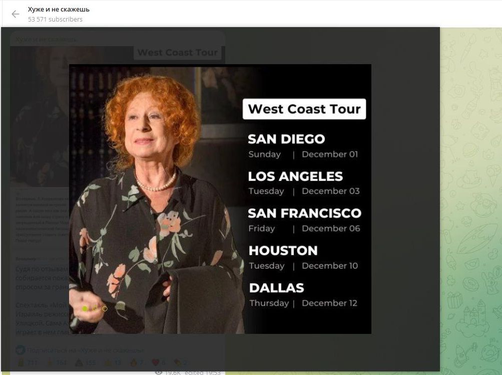 Афиша спектакля Ахеджаковой в России. Скриншот: телеграм-канал Colonelcassad