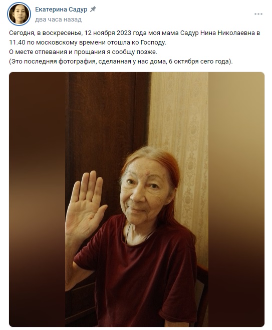 В воскресенье, 12 ноября 2023 года, моя мама, Садур Нина Николаевна, в 11:40 по московскому времени отошла к Господу,