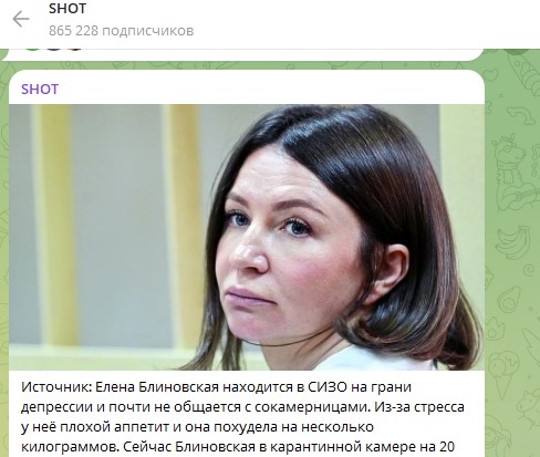 По данным SHOT, в настоящее время Блиновская находится в СИЗО подавленная и почти не общается с людьми. Её аппетит серьёзно пострадал от стресса, и она уже потеряла вес.