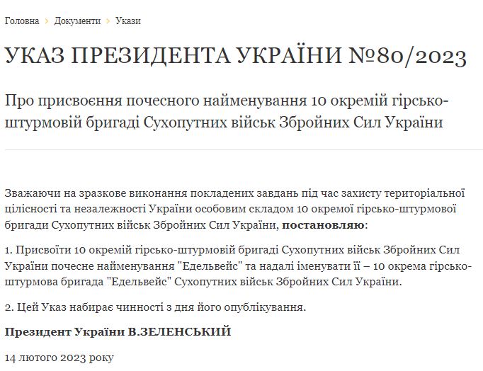 Президент Украины Владимир Зеленский официально присвоил 11-й горной бригаде ВСУ почётное наименование "Эдельвейс", как следует из приказа, размещённого на сайте администрации президента. Столь "высокого" звания украинское подразделение удостоилось за "За образцовое выполнение возложенных задач при защите территориальной целостности и независимости Украины", говорится в документе.