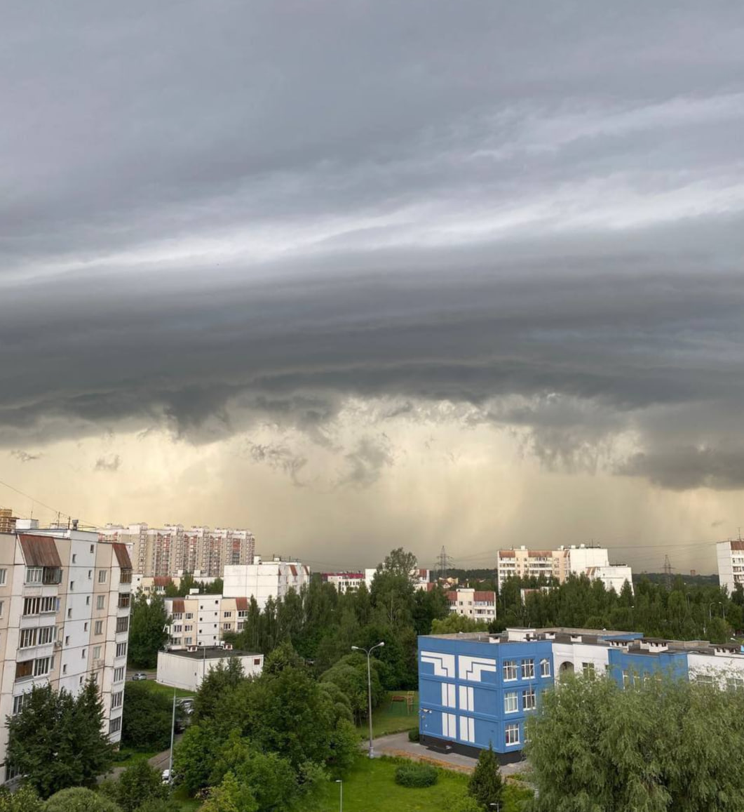 В Сети жители столицы делятся фото набирающих силу грозовых облаков, которые позднее пролились ливнем на районы Москвы.