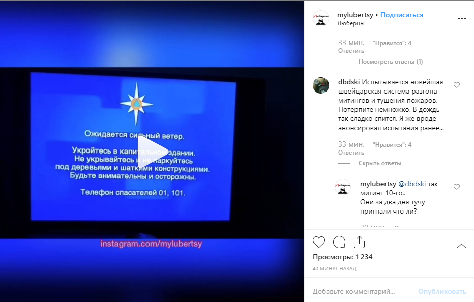 Экстренные сообщения об урагане и 10-балльном шторме в Москве удивительным образом отозвались в соцсетях. Например, в сообществе mylubertsy в социальной сети Instagram пишут, что в Москве "испытывается новейшая швейцарская система разгона митингов и тушения пожаров". Но волноваться не стоит...