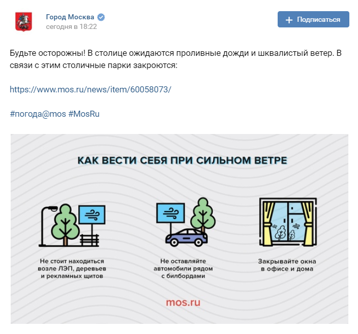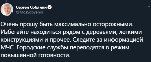 Собянин добавил, что привёл все городские службы в режим повышенной готовности. Тем не менее он призвал москвичей всё равно быть максимально осторожными. В связи с непогодой Гидрометцентр России объявил в Москве оранжевый уровень погодной опасности.