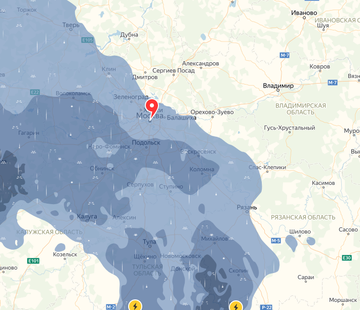 22:15 Между тем в Москве начался дождь. На карте можно увидеть, в какие районы гроза уже пришла.