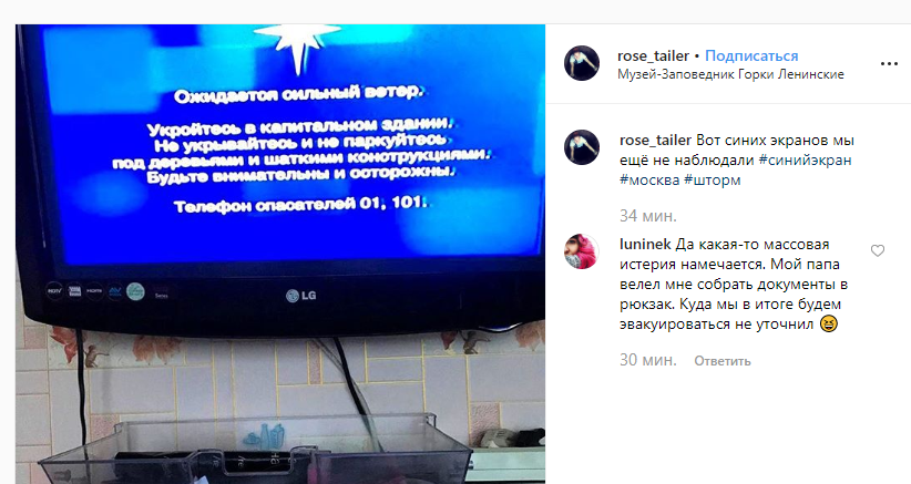 20:54 По информации жителей Москвы, в некоторых районах города наблюдаются проблемы с телевещанием. Кроме того, МЧС уже распространяет информацию о ненастье.