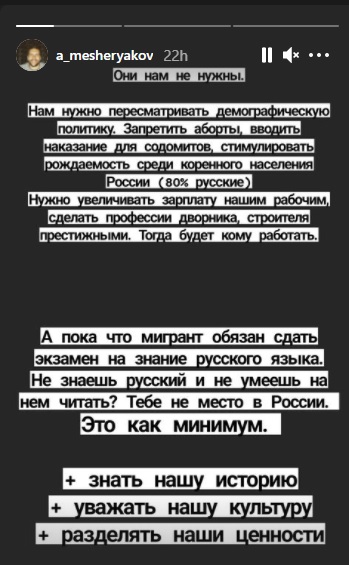 — написал Мещеряков и добавил, что если мигранты хотят работать в нашей стране, то им следует знать историю России и уважать культуру русских.