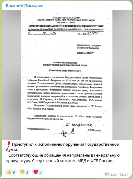Глава комитета Госдумы по безопасности и противодействию коррупции Василий Пискарёв направил в Генпрокуратуру, Следственный комитет, МВД и ФСБ России обращения с просьбой предоставить данные о релокантах, которые могли быть причастны к финансированию ВСУ. Также проверят на предмет нарушения закона высказывания ряда лиц, в том числе Ивана Урганта, Михаила Фридмана и Руслана Усачёва.