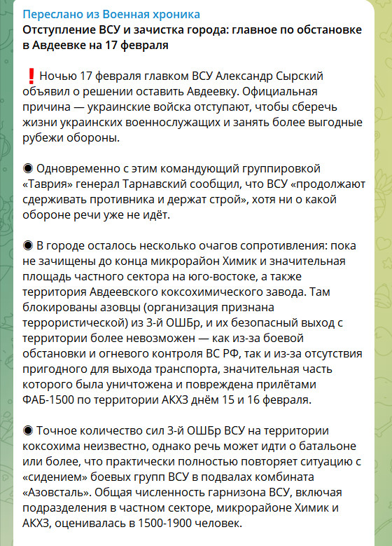 По информации телеграм-канала "Военная хроника", в городе ещё есть несколько очагов сопротивления: пока не зачищены до конца микрорайон Химик и значительная площадь частного сектора на юго-востоке, а также территория Авдеевского коксохимического завода. Там блокированы "азовцы"* из 3-й ОШБр, и их безопасный выход с территории более невозможен - как из-за боевой обстановки и огневого контроля русскими, так и из-за отсутствия пригодного для выхода транспорта, значительная часть которого была уничтожена и повреждена прилётами ФАБ-1500 по территории коксохима днём 15 и 16 февраля.
