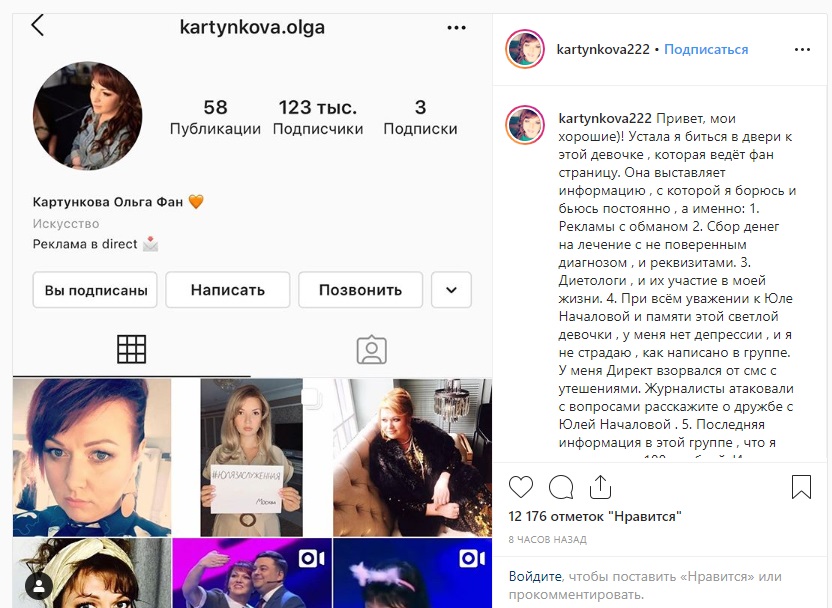 К слову, после поста кавээнщицы и советов ее подписчиков обратиться либо в прокуратуру с заявлением о мошенничестве, либо к администрации "Инстаграма" администратор фан-группы закрыла свою страницу, а потом подчистила и посты, о которых писала Картункова.