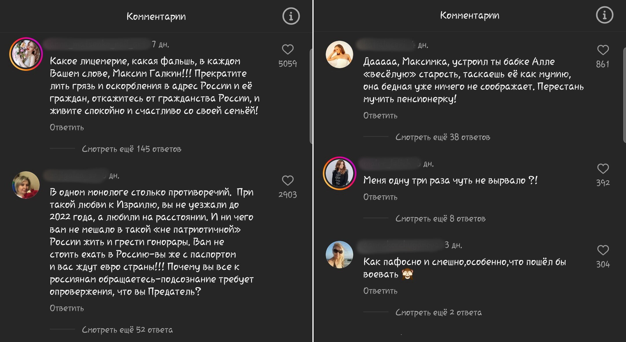 Несколько дней назад беглый шоумен Максим Галкин* в своём ролике поддержал войну Израиля против Палестины. Правда, добровольцем на фронт он почему-то не отправился, а поехал с гастролями на Кипр, откуда начнёт свой новый гастрольный тур по ЕС. После этого в комментариях разверзся настоящий "ад".