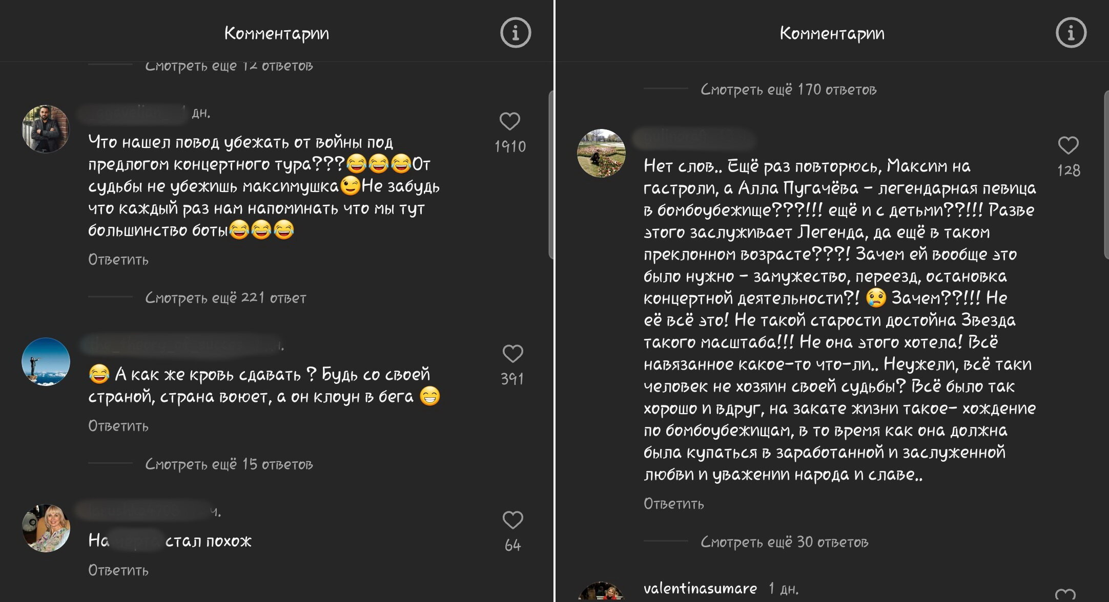 Нет слов... Ещё раз повторюсь, Максим - на гастроли, а Алла Пугачёва, легендарная певица, - в бомбоубежище? Ещё и с детьми? Разве этого заслуживает легенда, да ещё в таком преклонном возрасте? Зачем ей вообще это было нужно - замужество, переезд, остановка концертной деятельности? Зачем? Не её всё это!