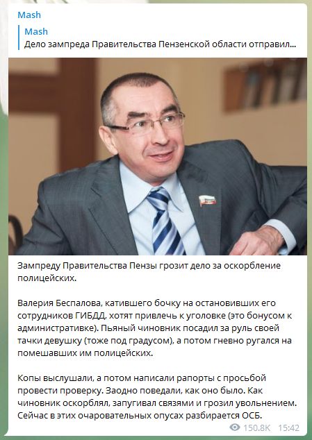 Пресс-секретарь губернатора Пензенской области Дина Черёмушкина сообщила, что в регионе ведётся служебное расследование из-за поведения человека, похожего на Валерия Беспалова – зампреда правительства Пензы. Он, как утверждают СМИ, устроил покатушки с пьяной дамой, а потом полез ругаться с сотрудниками ГИБДД.