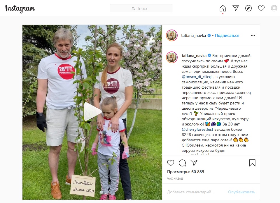 На видео семья Песковых сажает возле дома черешневое дерево. В процессе участвует сам Песков, его жена и их дочь. На кадрах видно, что за время карантина Песков изрядно оброс и обзавёлся бородой.